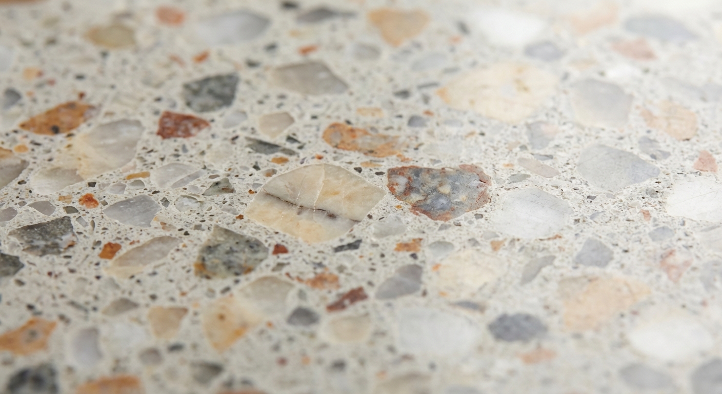 Traditioneller Terrazzo besteht aus Zement und Marmorsplittern. Moderner Terrazzo kann auch Kunstharz als Bindemittel verwenden und enthält oft auch Glas, Muscheln oder recycelte Materialien als Einstreuung.